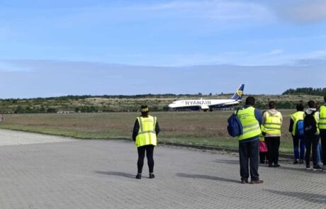 – przejazd autobusem po terenie lotniska z przewodnikiem, który opowiadał o pracy różnych służb i budynkach,